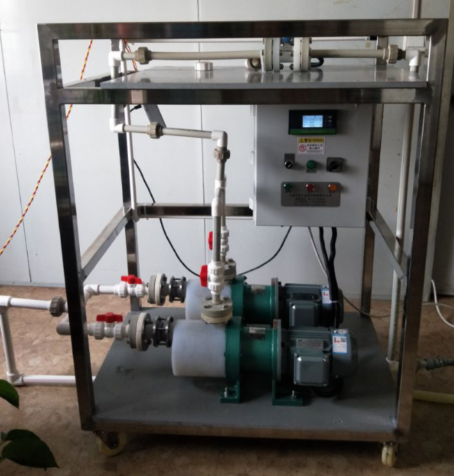 WDK氯化鈉配發(fā)料定量控制箱在雙聯(lián)泵定量控制系統(tǒng)移動(dòng)小車上的安裝使用的實(shí)物圖如下: