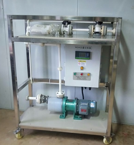 WDK氯化鈉配發(fā)料定量控制箱在單泵定量控制系統(tǒng)移動(dòng)小車上的安裝使用的實(shí)物圖如下: